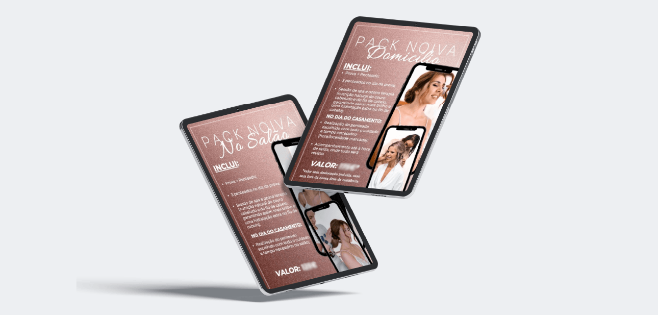 Documento elaborado no Canva para apresentação de packs “noivas” – tipo e-book, com todas as informações fornecidas pela cliente, para apresentar ao seu público.